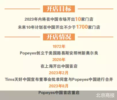 Popeyes如今的重启少不了Tims天好中国于幕后的策划,品牌重启更是有迹可循。今年2月,Tims天好中国宣布董事会批准同意与Popeyes中国进行合并,全股票交易后,Tims天好中国预计将获得Popeyes在中国内地和澳门独家经营权及特许经营权。今年5月,Tims天好中国发布公告称,今年目标在中国开设10家左右的Popeyes门店,预计下半年将重新开出第一家店。