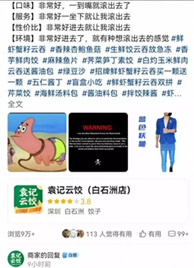 但其实这次事件的爆发波及的不仅仅是白石洲店的生意,还有袁记云饺其他店铺外卖平台的评价。