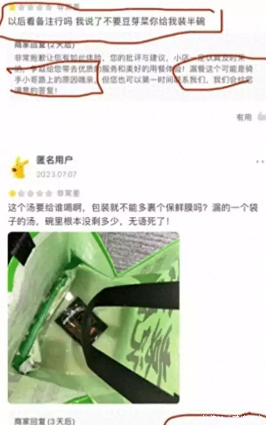 还有消费者不要豆芽但是袁记云饺不看备注装了半碗豆芽后,却在评论区说这事骑手小哥路上漏餐导致的,哪怕是用平台的快捷回复也稍微上点心吧。