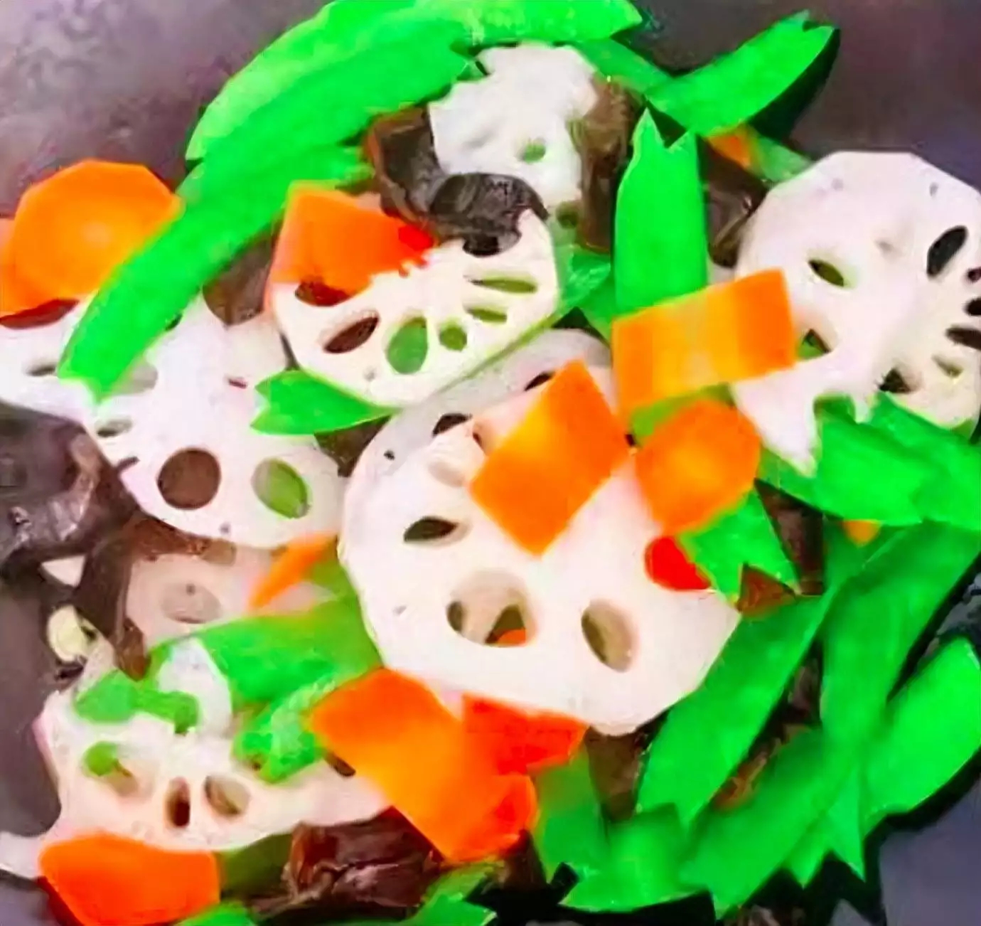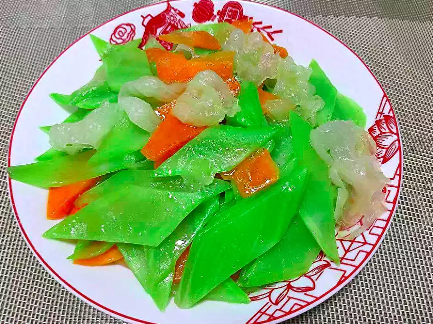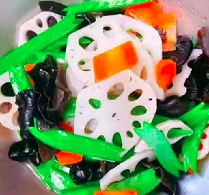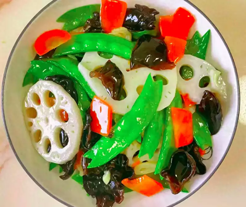 2、莲藕去皮洗净切片、荷兰豆剪掉老筋洗净、木耳泡发洗净、胡萝卜去皮洗净切片待用。