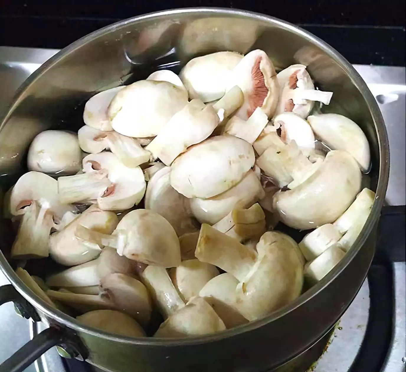 4、锅里加水煮沸,下入口蘑焯水,捞起沥干水。