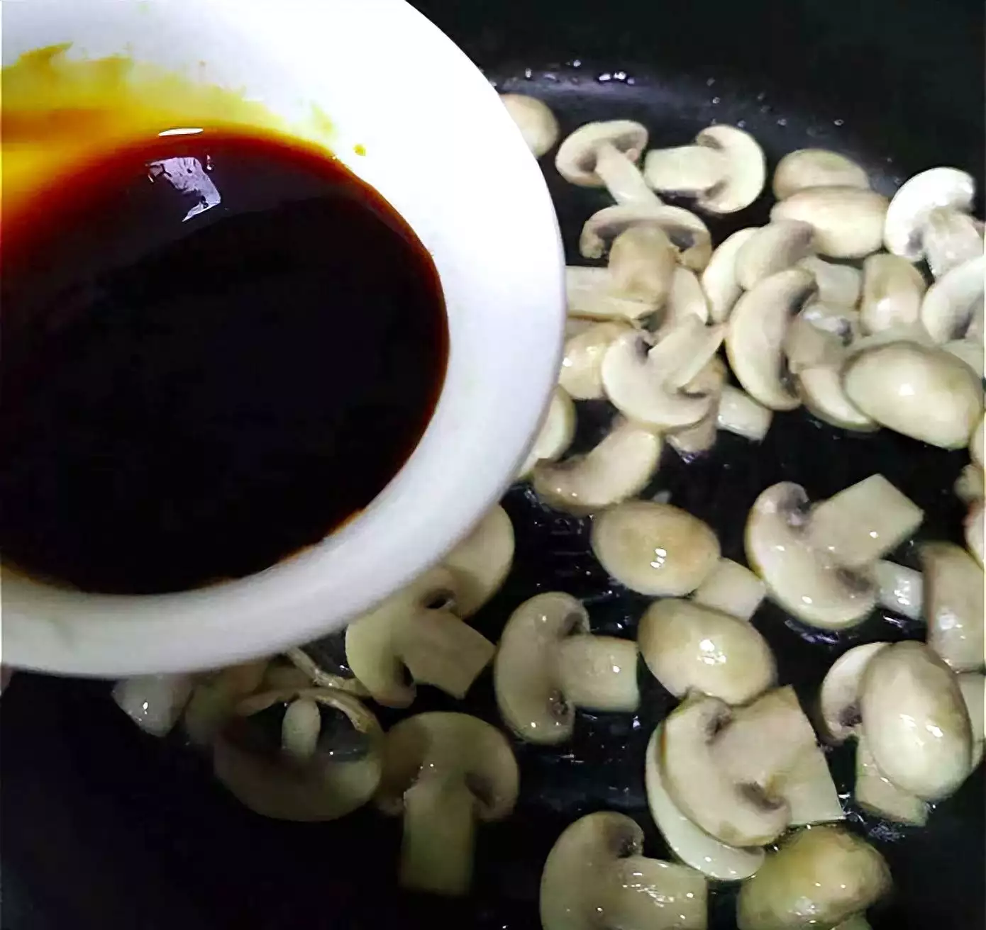 6、倒入生抽、蚝油、水淀粉、少许盐一起炒香,炒至口蘑吸收料汁汤汁收浓稠即可。