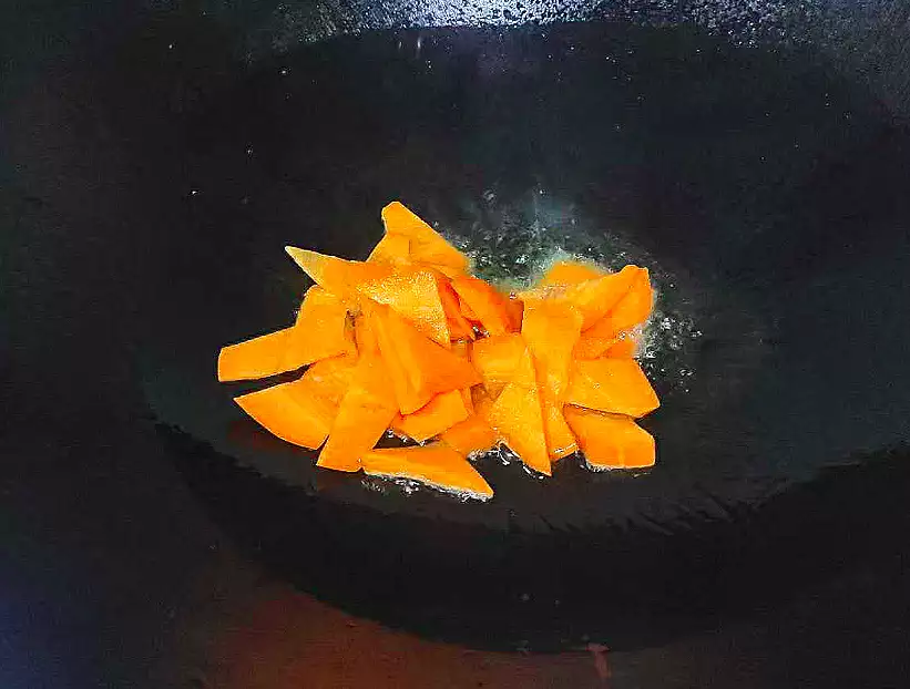 3、热锅凉油,下入胡萝卜炒香。