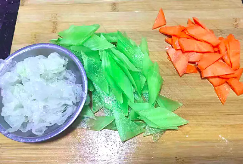 2、莴笋去皮洗净切片、胡萝卜去皮洗净切片、银耳泡发洗净撕成小朵待用。