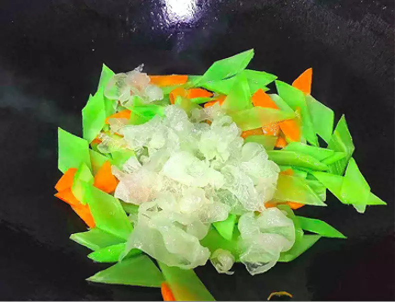 4、下入莴笋片和银耳一起炒均匀,加入少许盐和鸡精调味,炒匀即可。