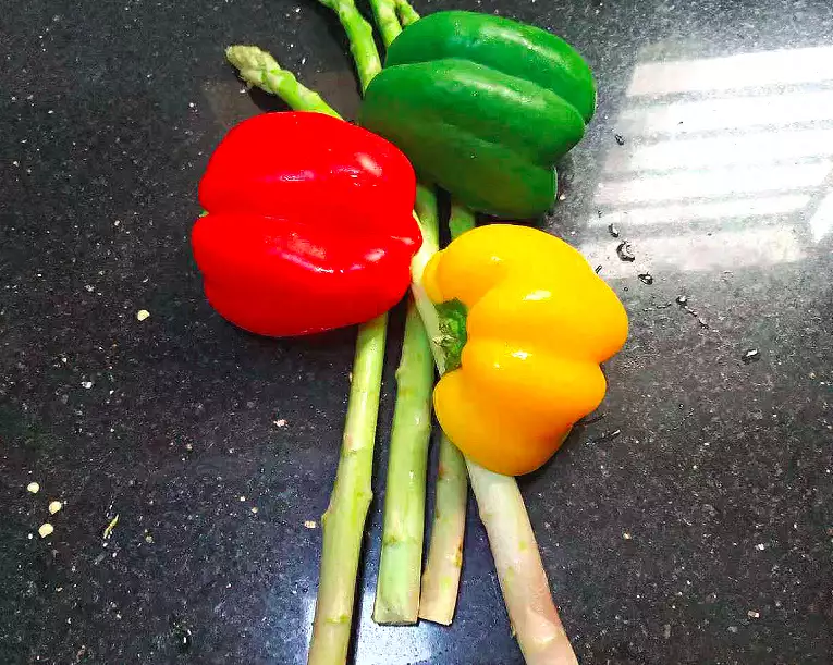 1、食材:芦笋、彩椒、大蒜。