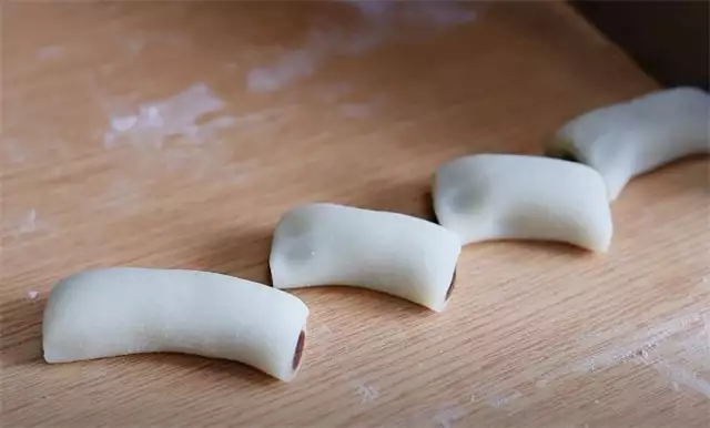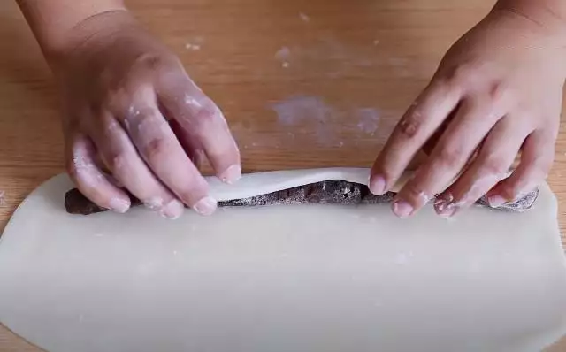 7.在上面铺上一层豆沙馅,然后从底部开始卷起来。