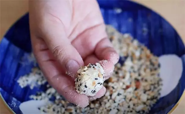 13.团好之后直接放在花生馅料里面,然后裹匀,这样我们的糯米球就做好了。