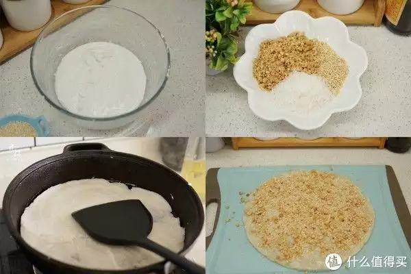 2、花生倒入无水无油的炒锅中,小火煸炒出香味盛出晾凉,白芝麻倒入锅中炒至微黄盛出,花生晾凉后倒入食品袋中,用擀面杖压碎,与白芝麻、椰蓉和一勺白糖放入碗中,并搅拌均匀。