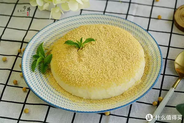 4、豆乳凝固后从冰箱中取出,倒扣在盘子上,用热毛巾捂在碗的周围,便于布丁脱模,脱模后撒上准备好的黄豆粉即可。