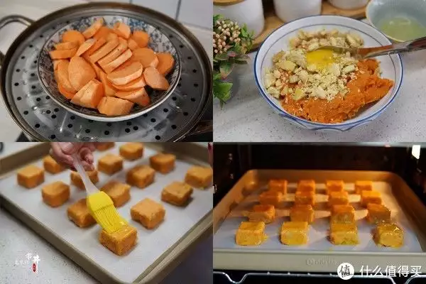3、将混合物放入模型中压平后脱模,切成正方形,再用手捏一捏,整理一下后放入烤盘上,刷上一层蛋黄,点缀上白芝麻。