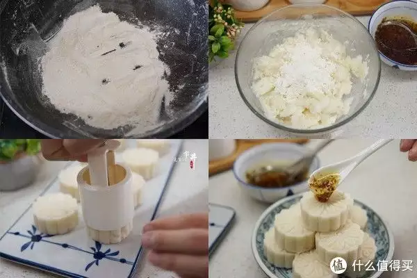 3、模具中撒上熟糯米粉,将山药糯米团放入模具中,按压成型后脱模。