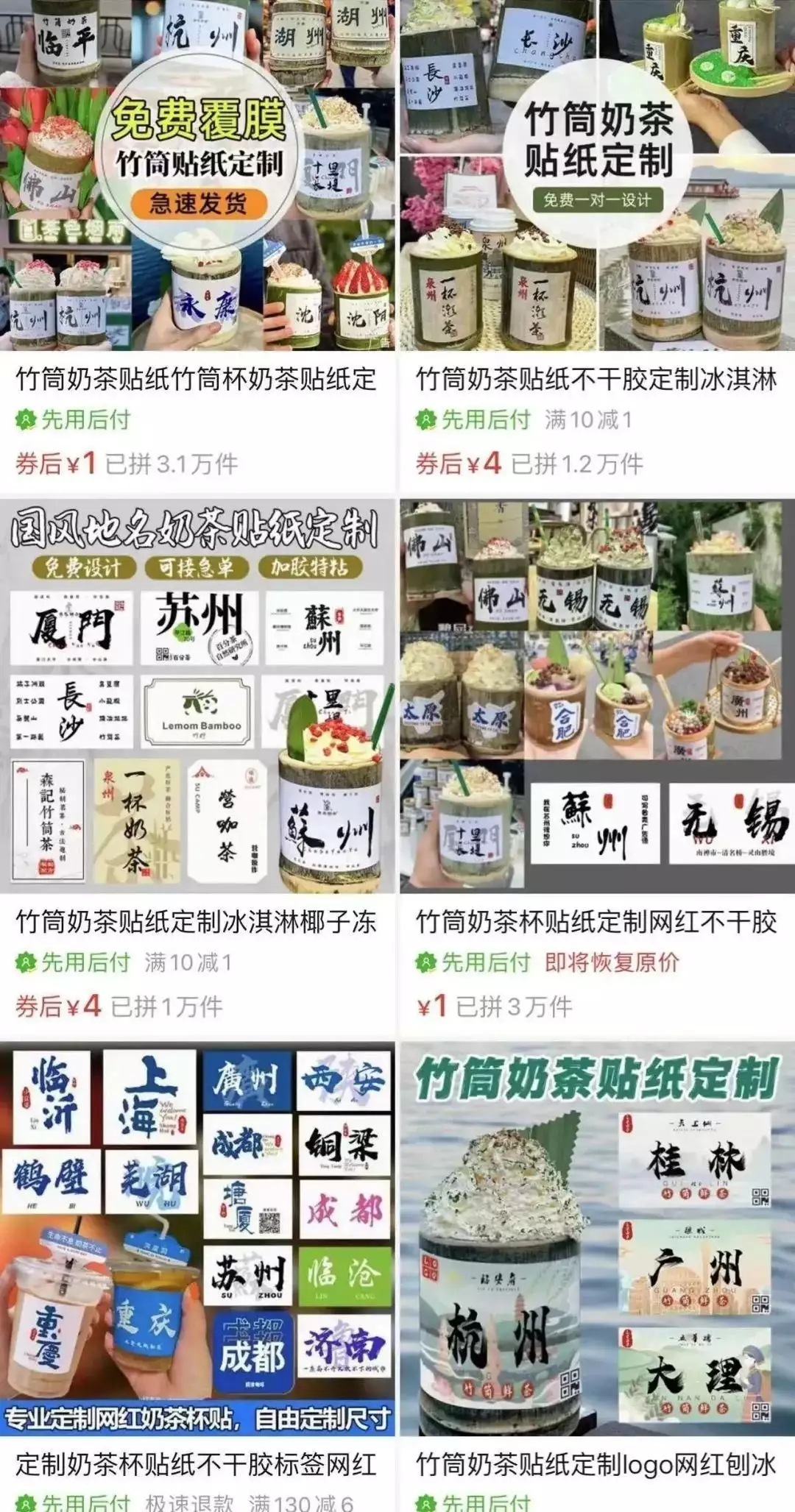 之所以竹筒奶茶能够成为地标打卡的单品,关键还有竹筒上带有不同城市名称字样的贴纸,如今贴纸定制业务也“卷”了起来。相较于普通的贴纸定制业务,目前为竹筒奶茶提供贴纸定制服务的商家开始从定制化服务上“打动”买家。