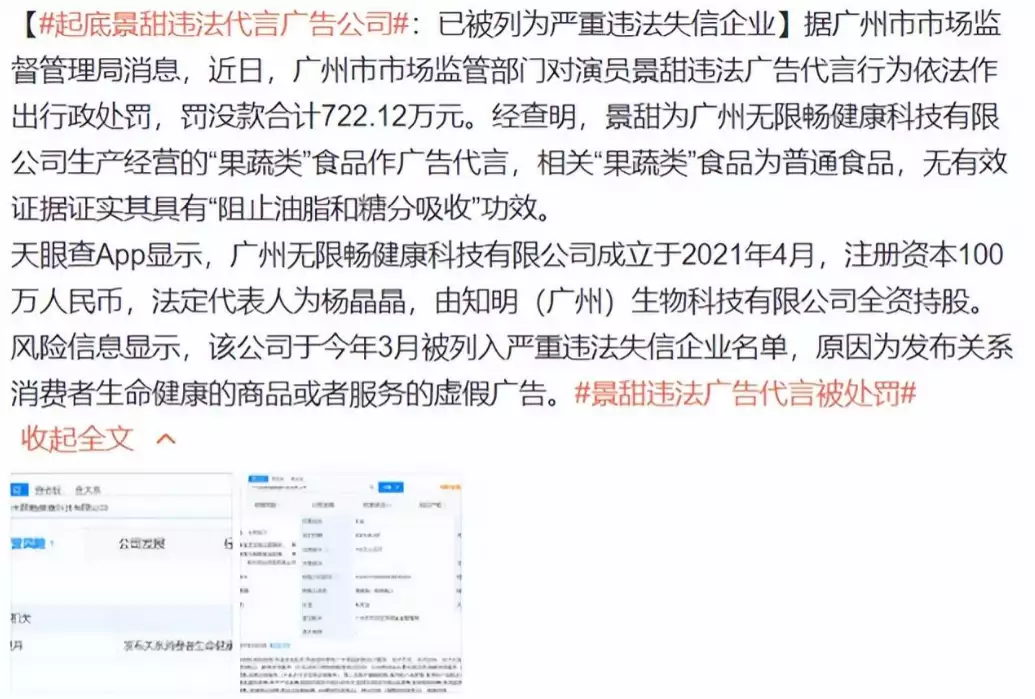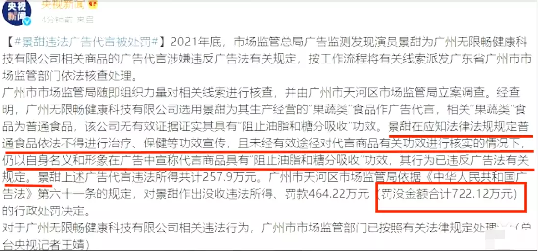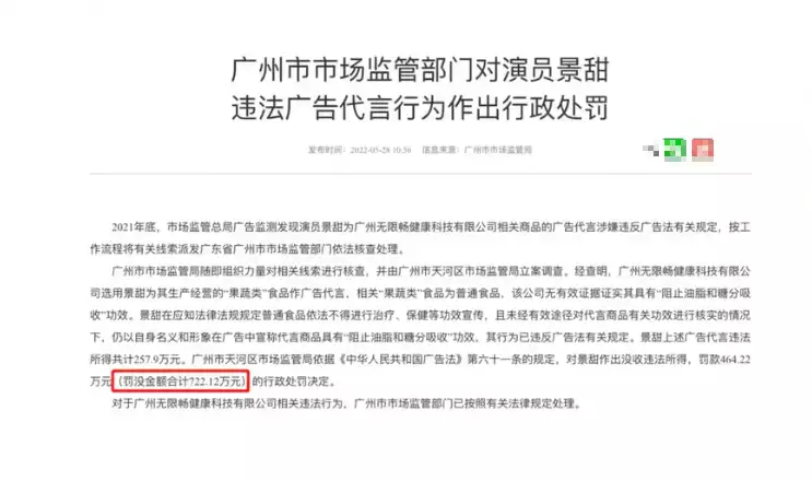 关于影星景甜代言虚假广告的处罚单。