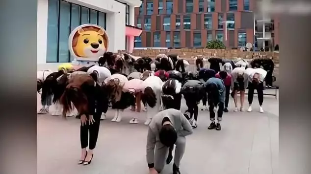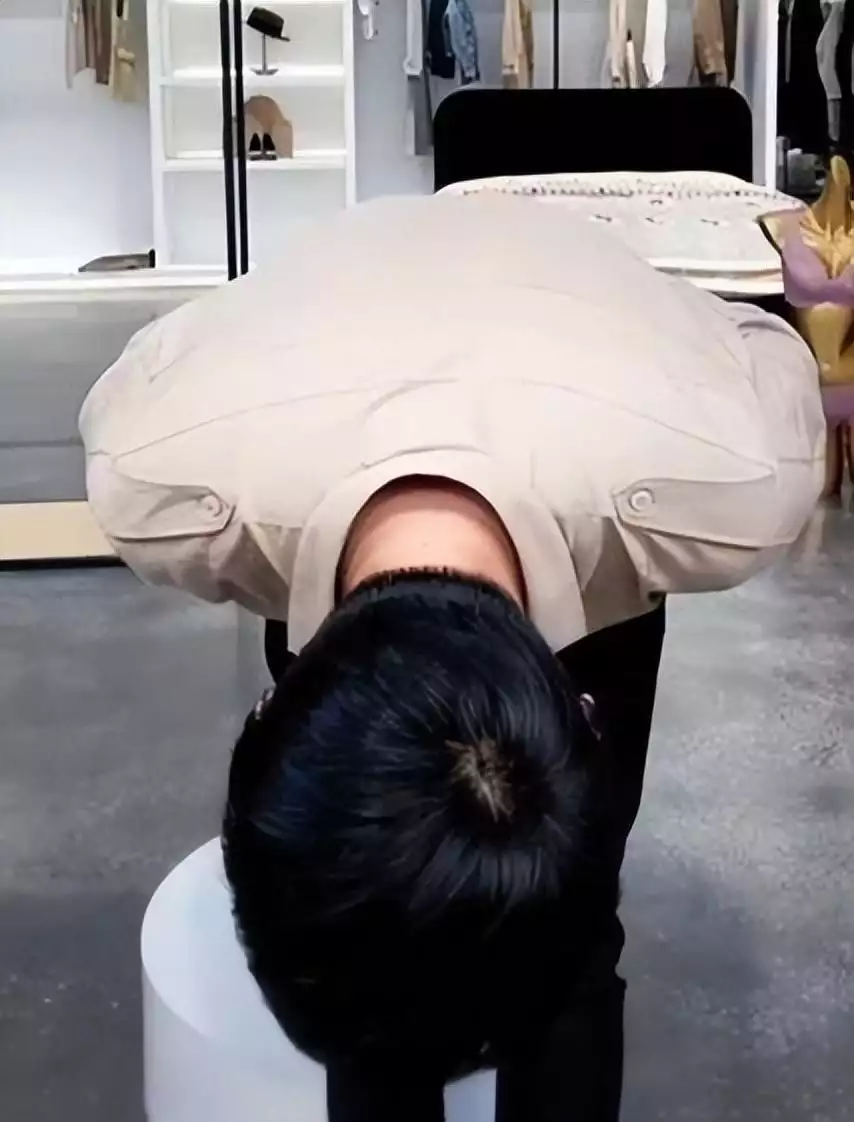 视频中辛巴携妻子初瑞雪和一众女员工单膝跪地高喊: