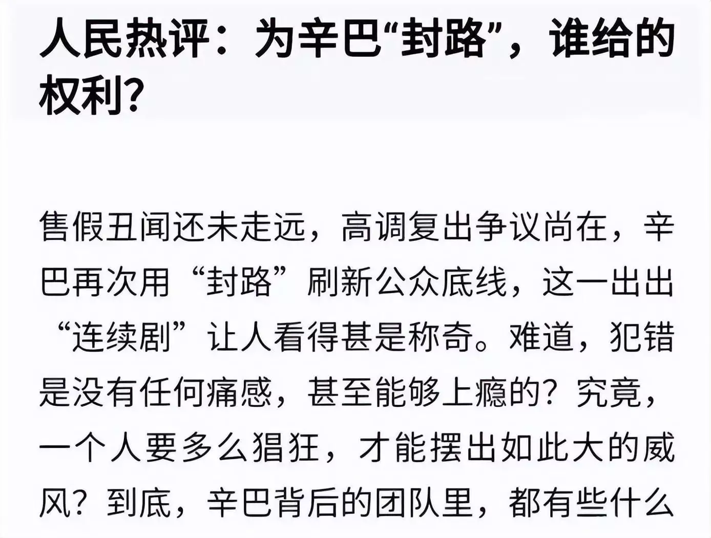 随着封路事件的持续发酵,权威媒体纷纷发文严厉指责辛巴。