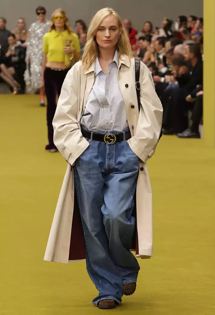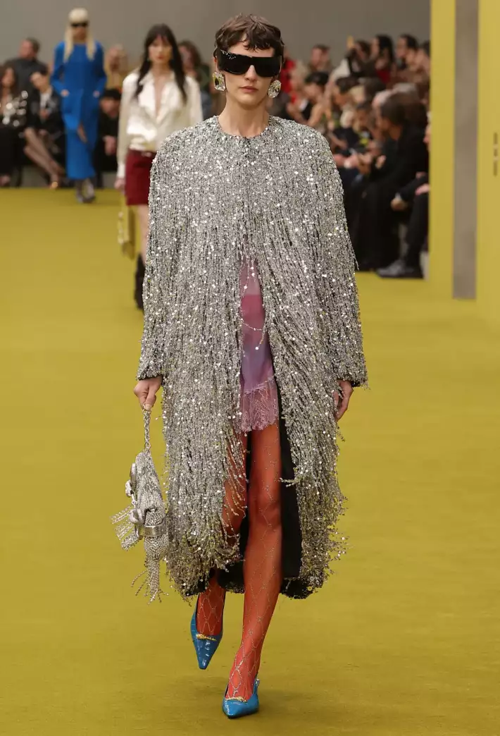 古驰2023秋冬女装系列以令人玩味的当代视角,将品牌不同阶段的创意文化相映串联。本季的廓形令人回想起1990年代至2000年代初期性感而迷人的古驰造型语言,它们在2010年代被赋予了绚丽多彩的华美色调。挺括肩角与低垂领口,并搭配低腰垂褶西裤来进行视觉切割。裙子则以精纺面料与加长或齐膝设计,蕾丝装饰元素散发贴身内衣的气息。镶满水晶的GG金属内衣亦是如此,在领口和胸部垂挂造型夸张、长度及地的鸡尾酒会珠宝。