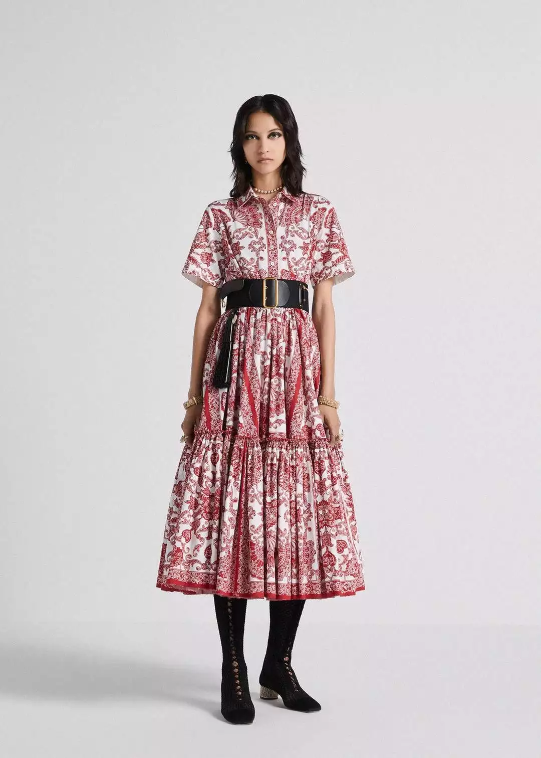 迪奥于2023早春成衣系列中呈献充满诗意的DIOR BANDANA图案,由女装创意总监玛丽亚·嘉茜娅·蔻丽(MARIA GRAZIA CHIURI)打造,歌颂安达卢西亚文化。DIOR BANDANA图案之上,精美扇形纹样与蔓藤花纹相映生辉,巧妙诠释塞维利亚轻盈连衣裙之上的蕾丝饰面。图案轮廓以精妙繁复的红色或黑色心形点睛勾勒,装点于真丝斜纹衬衫、棉质华达呢或MITZAH围巾之上,谱写柔情宣言。