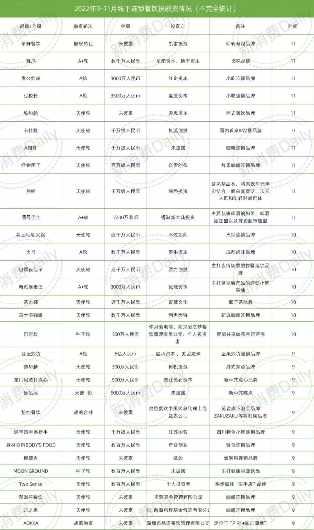 实际上,据新消费Daily不完全统计,在刚刚过去的9-11月,共有30个线下连锁餐饮品牌获得融资,其中炸串、炸臭豆腐、烘焙这些偏小吃类型的项目更备受青睐。