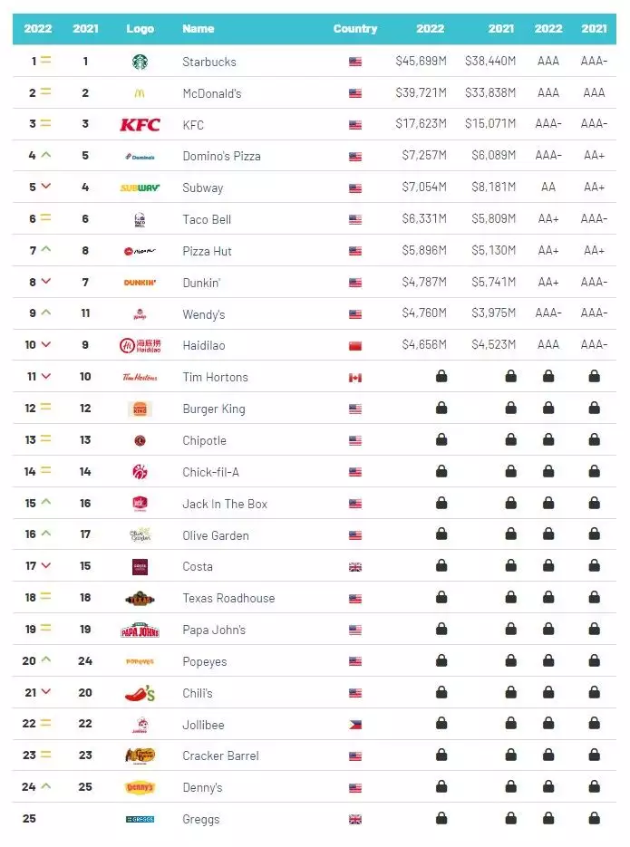 从英国品牌评估机构BrandFinance发布的2022年全球最有价值25家餐厅品牌榜单可以看到,20家都是美国的餐饮品牌,且基本都是像麦当劳、赛百味等以连锁、加盟为主的品牌。
