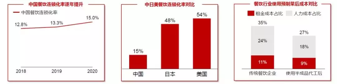 以餐饮行业为例。华兴资本与中国连锁经营协会(CCFA)联合发布的《2022年中国连锁餐饮行业报告》显示,中国餐饮连锁化率在逐年提升,2020年已达到15.0%。但日本餐饮连锁化率高达48%,美国餐饮连锁化率高达54%。