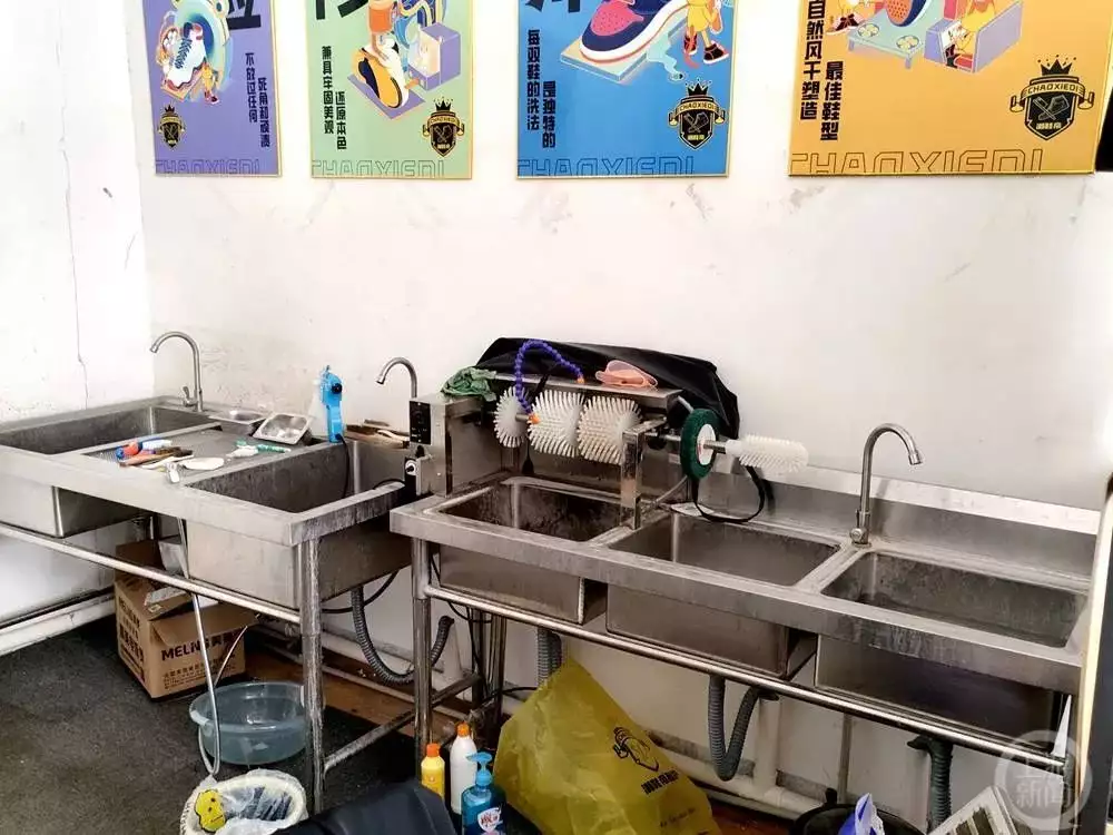 4月14日,记者来该店探访时,店内只有一名女店员。她向记者介绍,小张下午下课后,会去学校收鞋,然后拿回店里洗,第二天将鞋送还客户。洗鞋主要靠小张、小张的同学以及请来的洗鞋师傅。她的主要工作是前台,忙不过来时,她也会帮忙洗,月工资是四五千元。“店里一天要洗七八十双鞋。”