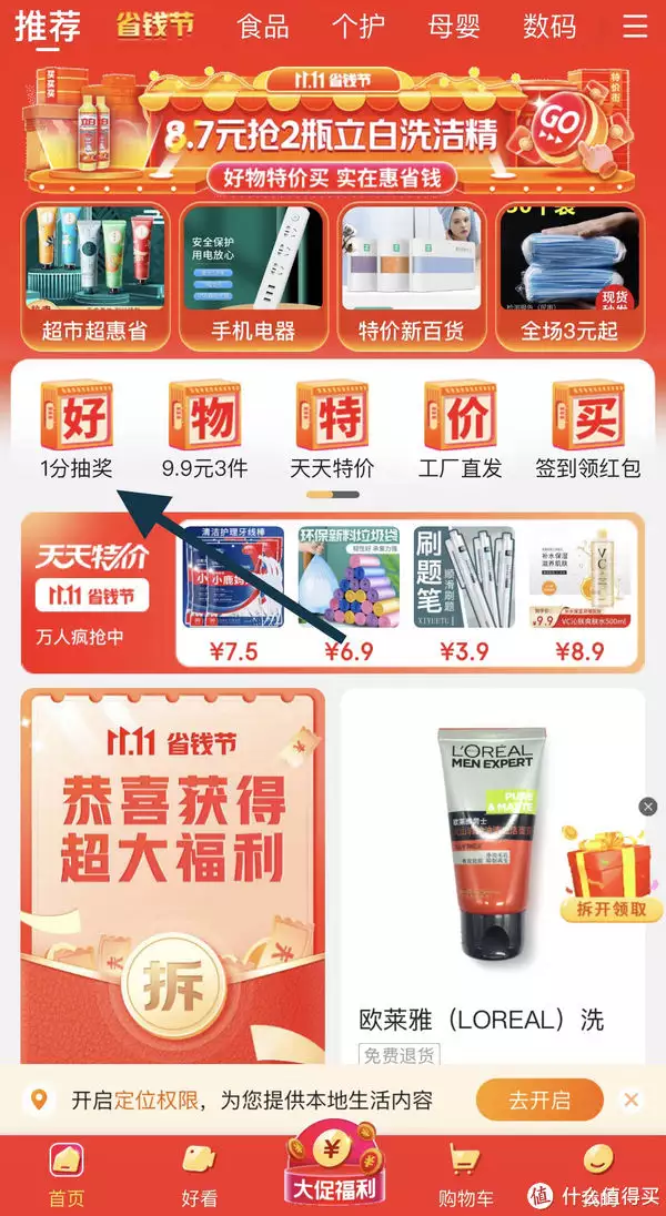 渠道:首页左上方图标“1分抽奖”。