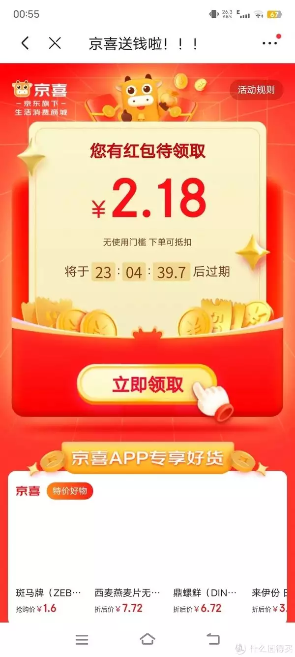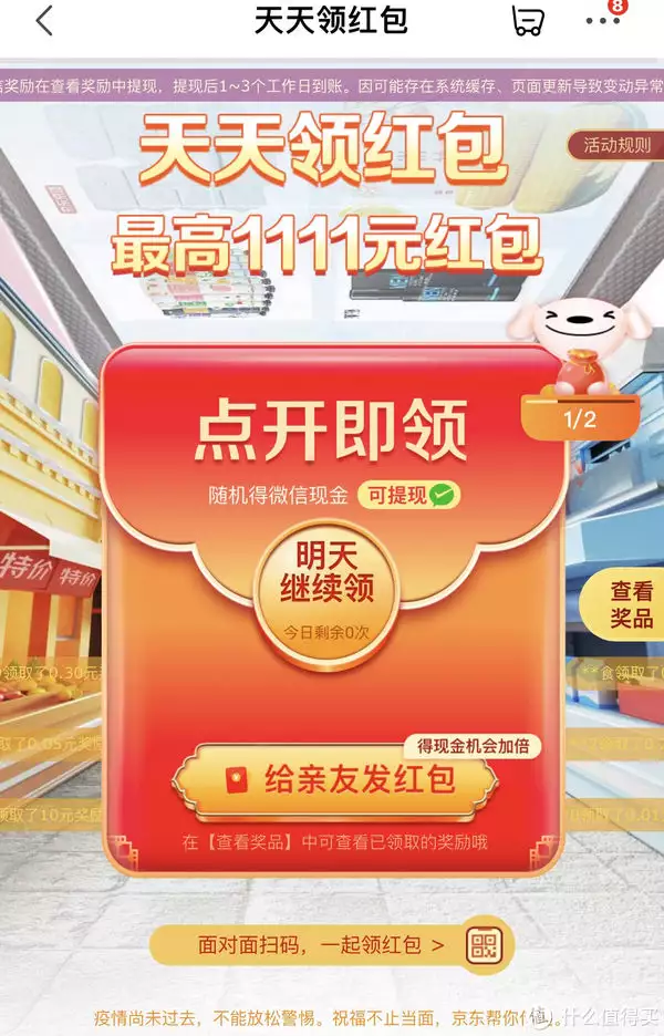 立即领取,分别对应京东金融白条券、京喜红包、京东特价版红包。每天一般都可以领两种。领完一次,重新进入又可以领一次,或者直接刷新。