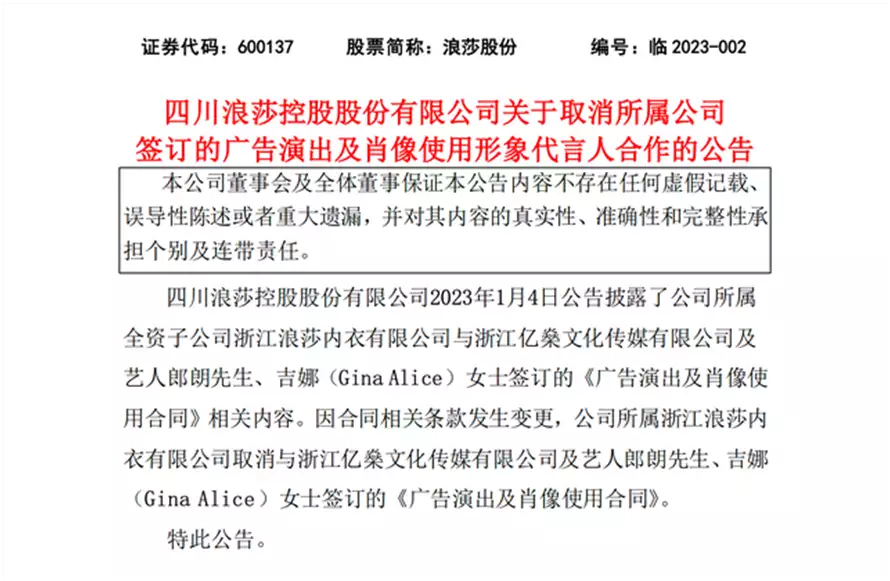 1月4日晚间,浪莎股份发布的一则公告称,因合同相关条款发生变更,公司所属浙江浪莎内衣有限公司(以下简称“浪莎内衣”)取消与浙江亿燊文化传媒有限公司及艺人郎朗先生、吉娜(Gina Alice)女士签订的《广告演出及肖像使用合同》。