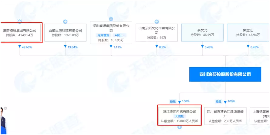 根据天眼查显示,浪莎控股集团为浪莎股份大股东。浪莎股份以内衣业务为主营业务,浪莎内衣是浪莎股份的全资子公司;浪莎还以袜业出名,浪莎的袜业主体是浪莎针织有限公司(以下简称“浪莎针织”)。
