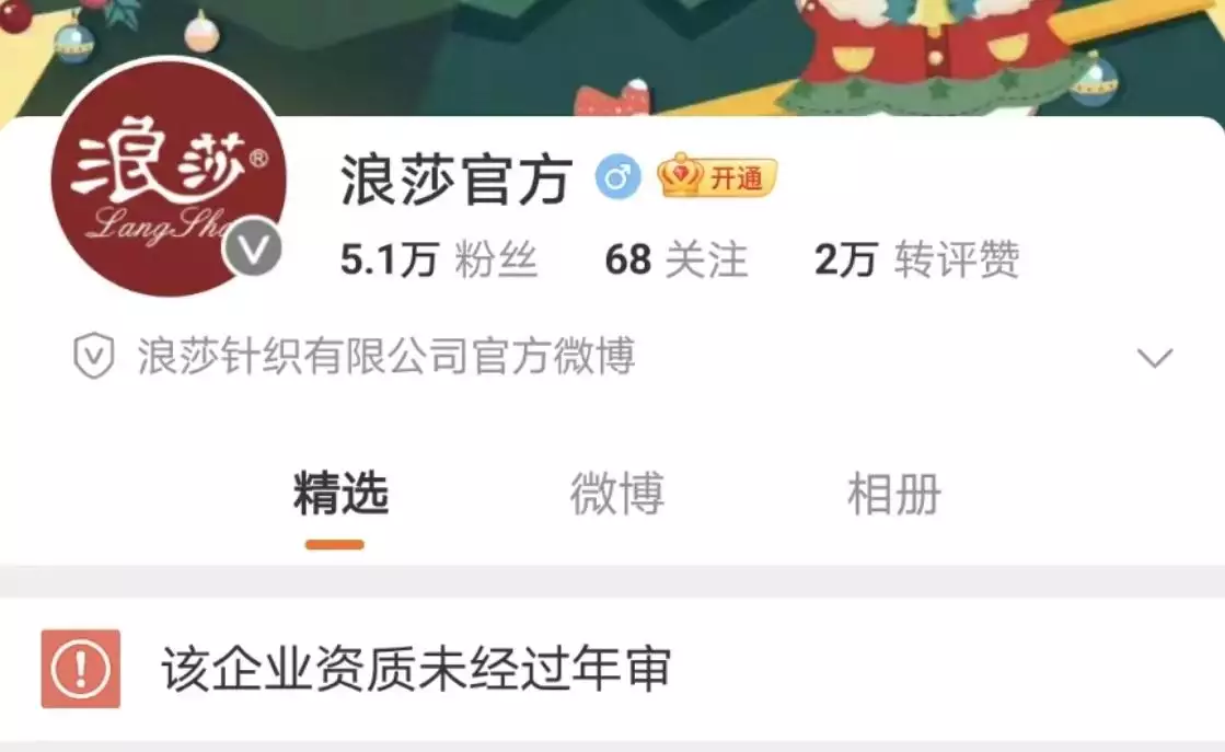 红星资本局注意到,浪莎在微博上拥有一个“浪莎官方”的账号,主体是浪莎针织,粉丝数为5.1万,其首页显示,企业资质未经过年审。目前,其最新一条微博停留在2020年10月。