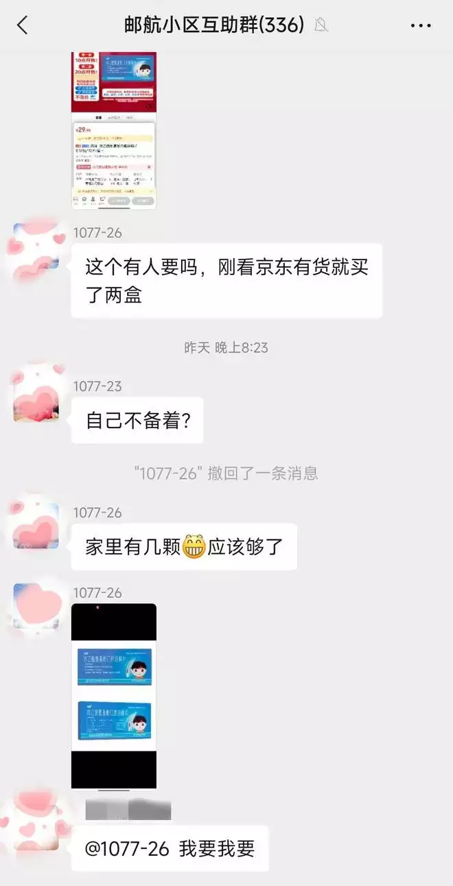 居民区多措并举,守牢为民服务底线,而来自居民之间的善意也在开始小区互助群里流淌,居民们自发在群中共享应急药品,这份邻里守望的“接力赛”也让真情不断传递。