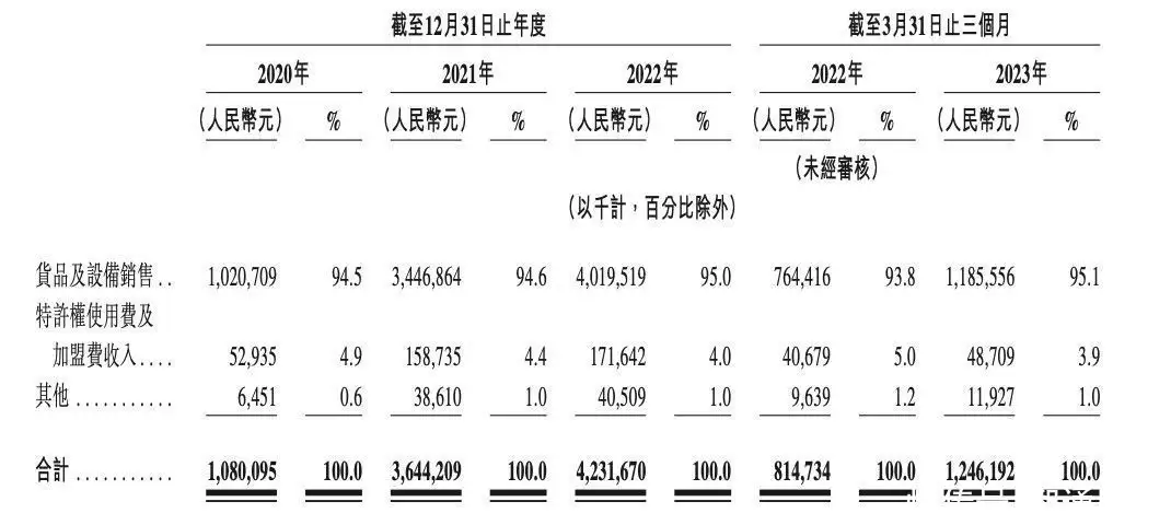 从收入来源分析,向加盟销售货品和设备是茶百道最主要的营收来源,2020年-2022年及2023年首三个月,来自该经营分部的营收来源分别为10.21亿元、34.47亿元、40.2亿元及11.86亿元,营收占比维持在95%左右。而特许权使用费及加盟费则是公司的第二大营收来源,报告期内来自该分部的营收占比在4%左右。
