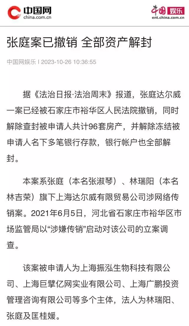 而就在今天一则张庭96套房产解封的消息迅速爆到了热搜第一的位置,一看才知道,原来是两年前张庭和林瑞阳夫妇的传销案被撤销了,张庭达尔威一案已经被石家庄市裕华区人民法院裁定解除对其资产的查封,解除查封被申请人共计96套房产,并解除冻结被申请人名下多笔银行存款,银行账户也全部解封。
