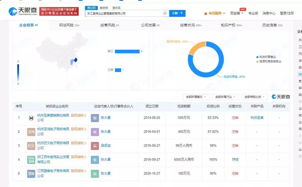 天眼查App显示,花西子关联公司浙江宜格企业管理集团有限公司成立于2016年7月,注册资本5000万元人民币,法定代表人、执行董事兼总经理均为张大勇,经营范围包括企业总部管理、企业管理咨询、化妆品零售、批发等。股东信息显示,该公司由吴成龙、吴成宝分别持股99%、1%。对外投资信息显示,在该公司投资的多家企业中,目前仅浙江百年宜格实业发展有限公司为开业状态。