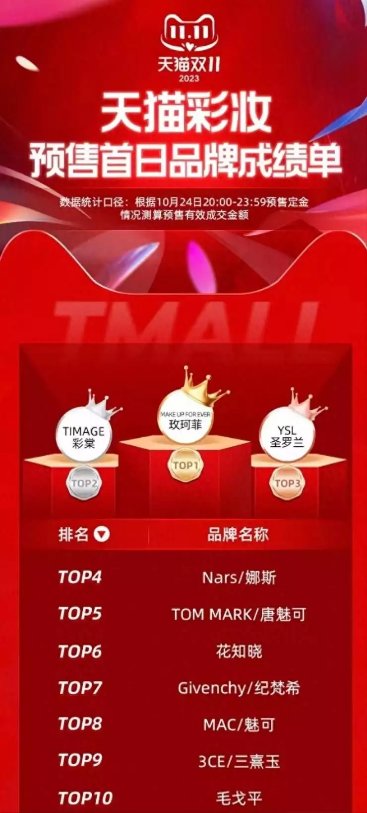 据天猫官方数据,在天猫彩妆品类首日预售榜单的前20名中,外资品牌14个,国货品牌6个。而去年榜上有名并排名第4的花西子,今年却跌出了前20的榜单。