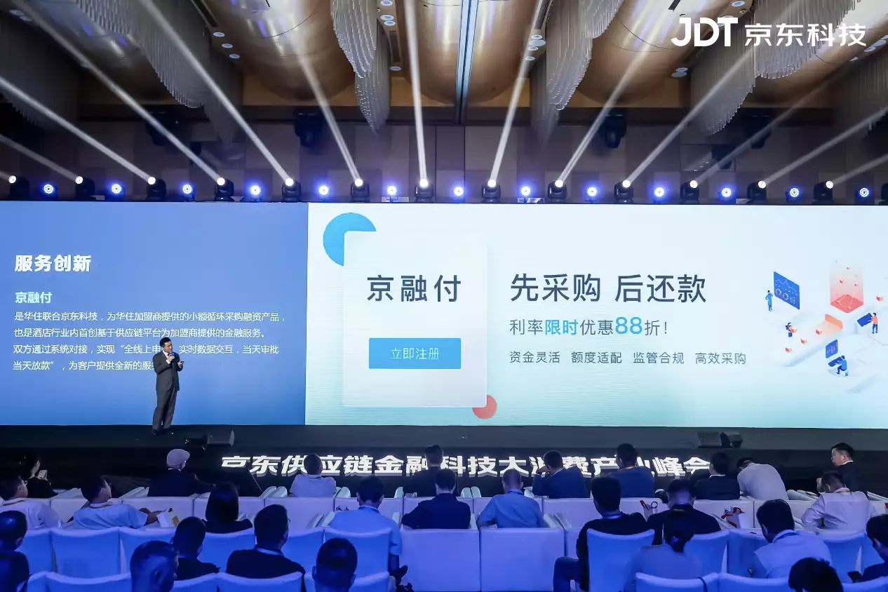 现场,谢成晟还介绍了华住集团与京东供应链金融科技联合推出的“京融付”产品。这款产品是酒店行业首创基于供应链平台为加盟商提供的小额循环融资服务。产品围绕新店营建及在营店运营等场景,可为客户提供最长3年期最高500万元的融资额度。产品风控基于双方共建的四流模型打造,首次在行业内实现“线上申请、快速放款”,为酒店加盟商提供了全新的服务体验。