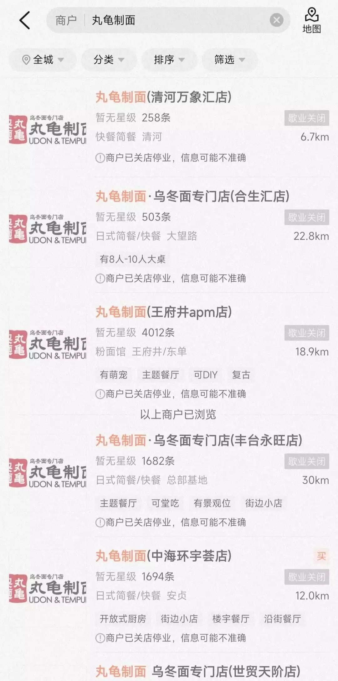 2020年算是丸龟制面的巅峰时期,其在中国内地的门店数量有45家,以一线城市上海和北京为主要阵地。而自2021年6月起,丸龟制面开始在中国内地、香港等地区收缩门店;2022年更是加快了闭店进程。据界面新闻报道,2022年8月,丸龟制面最终关闭了在中国内地的所有门店。