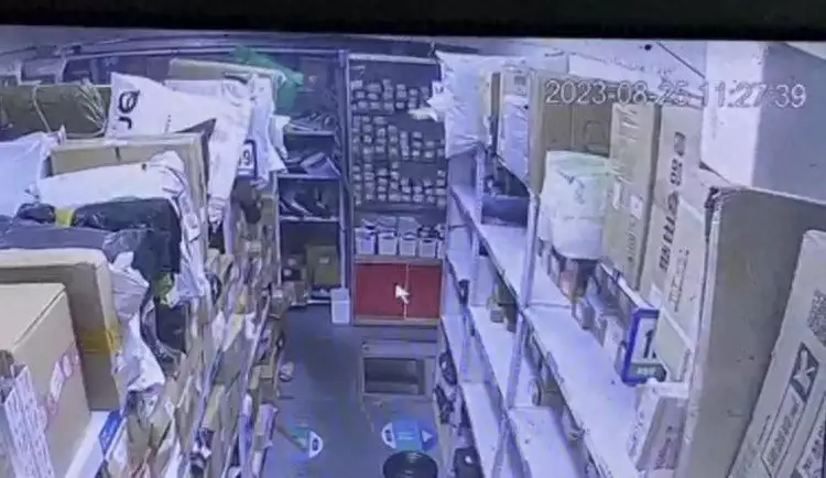 监控视频显示,在两列快递货架的拐角处,紧邻墙壁的地面上有一方形洞口,一位疑似店内工作人员将一小件快递从洞口投下后,一女子走过来并未留意到洞口,一脚踩空斜着身子跌落。
