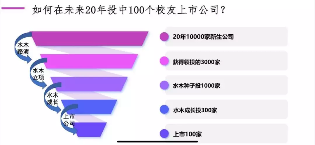 具体而言,“第一,应看尽看10000家清华校友新创企业,同时通过每周三的水木路演初筛出3000家企业;第二,水木立项会再从这3000家有领投机构投资的企业中,选择投资其中的800-1000家;第三,水木未来也会成立一支成长基金,继续加码投资水木种子基金已投资企业中的300家,我们希望这300家企业里大概有100家上市公司。”