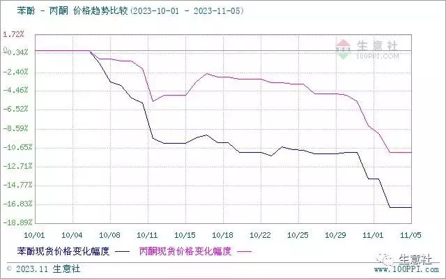成本面利空。近期国内苯酚市场跌势主导,10月30日国内苯酚市场报盘在8425元/吨,11月5日下跌至7950元/吨,其中华东地区报盘为7650元/吨。丙酮市场宽幅下行为主,10月30日国内丙酮市场报盘在7425元/吨,11月5日下跌至6937元/吨,其中华东地区报盘至6450-6550元/吨。原料酚酮市场宽幅下行,下游补货意向增加,贸易商继续下调价格,出货意向减弱,预计短期市场区间调整运行为主,重点关注原油及酚酮上游产品变化情况。