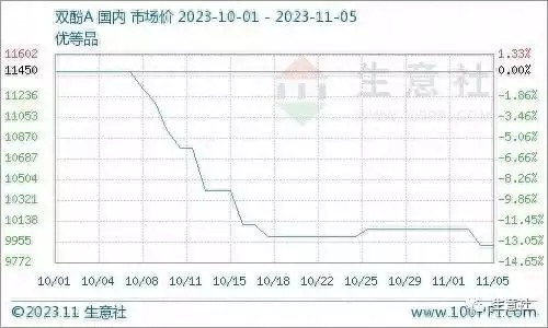 智通财经APP获悉,11月6日,据生意社商品行情分析系统,近期国内双酚A市场走势偏弱,主要是下游需求表现不佳,贸易商出货压力下,不得不让利出售。上周末双酚A主流市场报盘在9925元/吨,周度下跌150元/吨左右。生意社来看,双酚A双原料宽幅下行,成本面难有支撑,虽然双酚A自身开工率有所下滑,但对市场影响不大,月初下游环氧树脂和PC对双酚A消化合约和库存为主,新单量有限,面对实单贸易商让利出货意向较大,预计短期双酚A弱势调整,关注双原料变化及主力工厂价格调整情况。