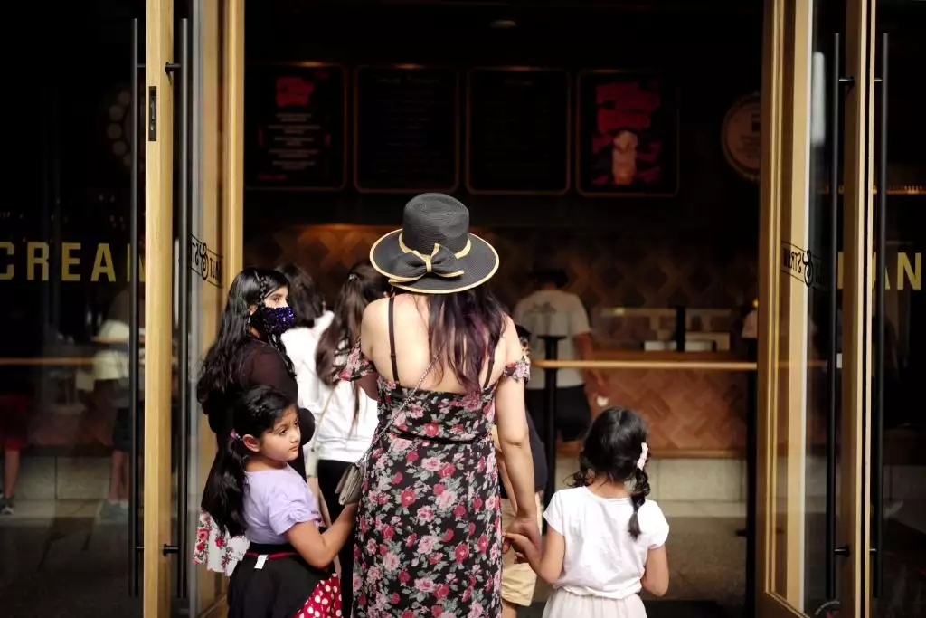 2021年7月10日,在美国旧金山湾区城市圣拉蒙一个购物中心,人们排队购买冰激凌。新华社记者吴晓凌摄