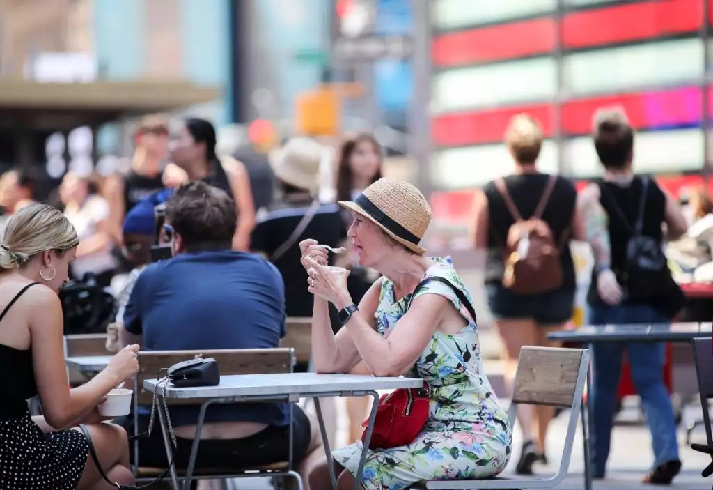 2018年7月2日,在美国纽约市时报广场,人们吃冰激凌降温。新华社记者王迎摄