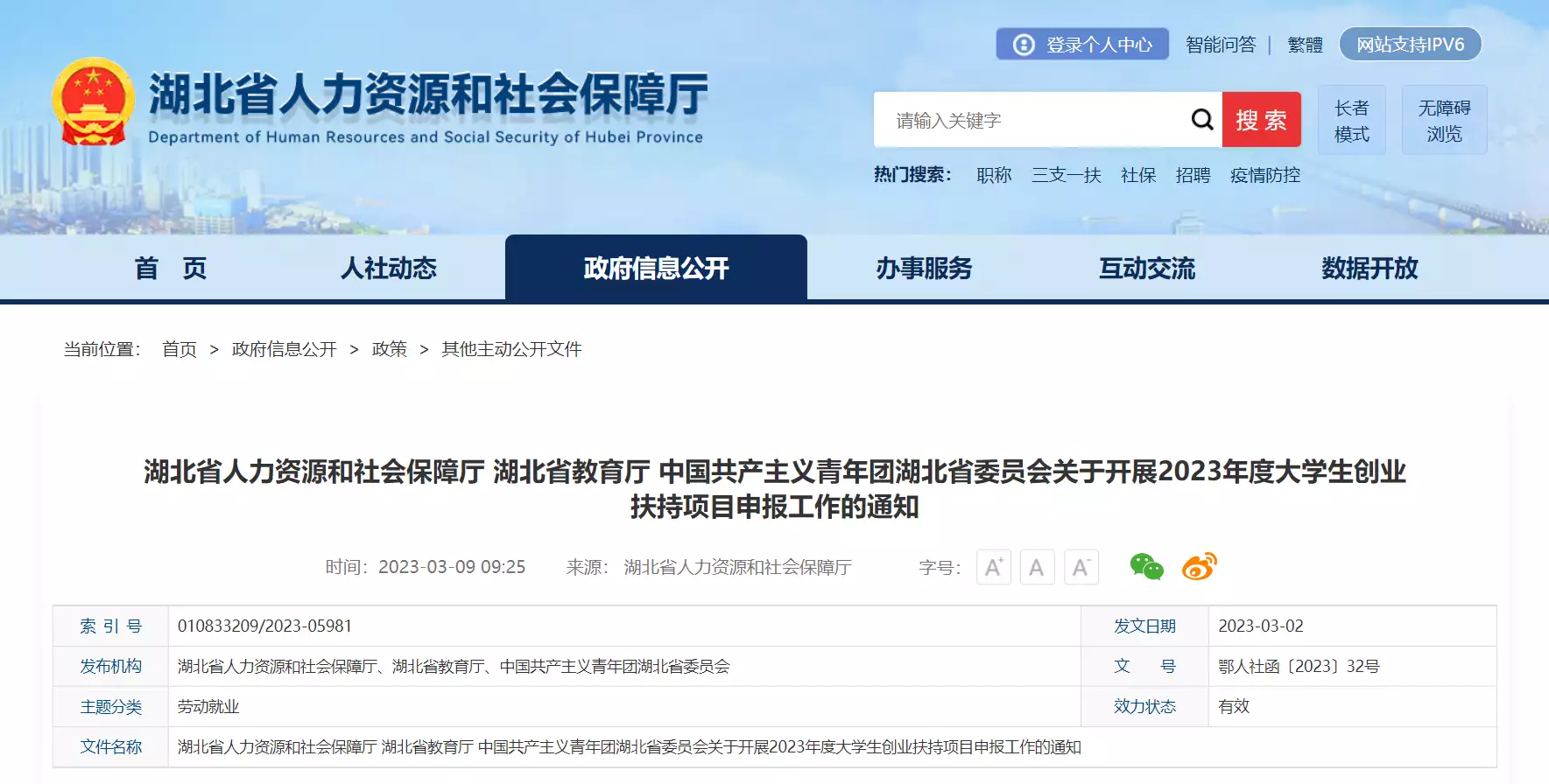 3月9日,湖北省人力资源和社会保障厅发布关于开展2023年度大学生创业扶持项目申报工作的通知↓↓↓
