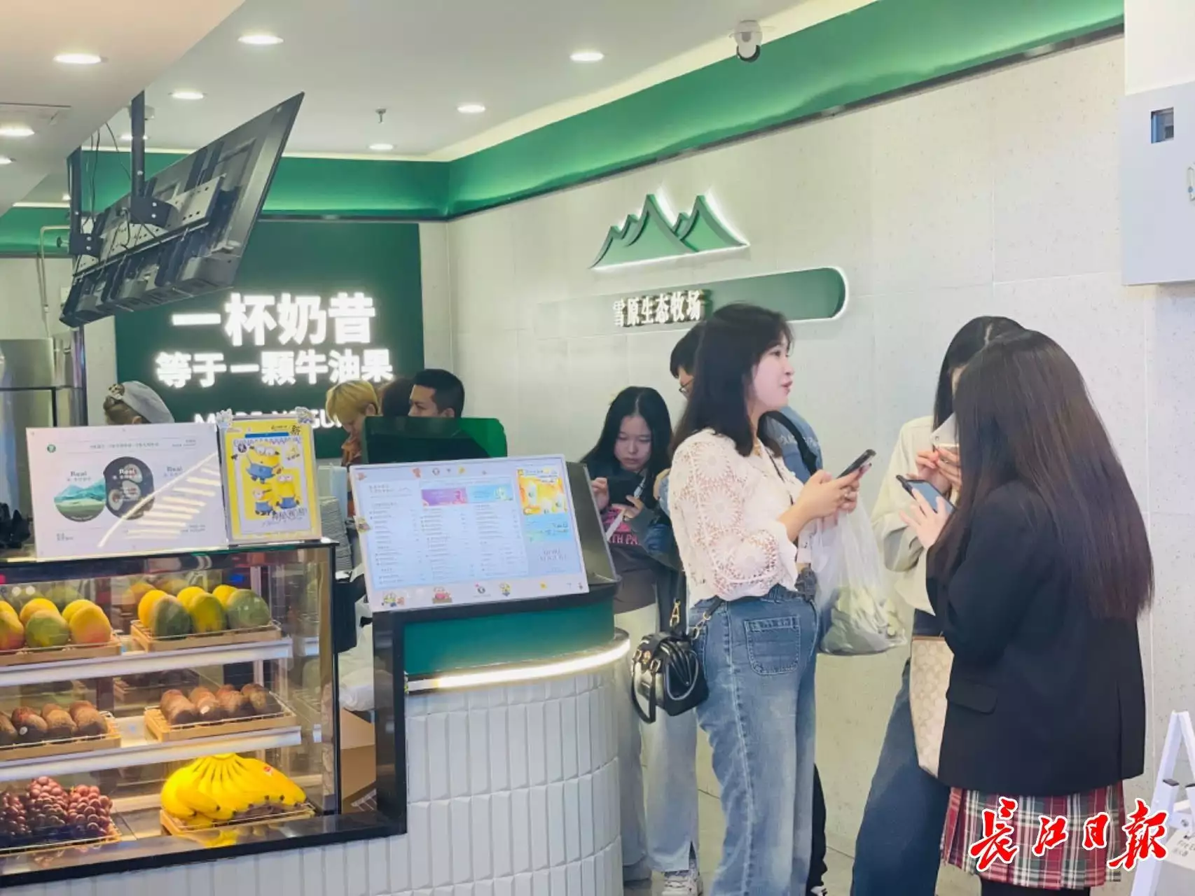 就在离这家店不到10米的地方,是酸奶界的头部品牌茉酸奶。记者通过品牌点单小程序搜索,茉酸奶在武汉有22家门店,均价在30元以内。正值下班高峰,顾客不少。和大学同学逛江汉路的“维尼”告诉记者,无论在哪个城市,看到茉酸奶就会喝。去年8月,作为现制酸奶品类中的现象级品牌,茉酸奶首店在江汉路MARK食集和武汉银泰创意城同开,凭借“酸奶+新鲜水果”的新CP,高颜值、新口感、强话题,引得众多人前往品尝。仅仅一年时间,门店规模扩充至22家。