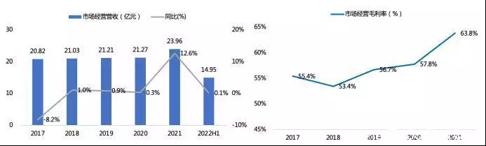 >从“收租”转型“卖货”让我们没有想到的是,义乌小商品城作为全国最大的小商品集散地,竟然是靠“收租”来赚钱的。那么,“收租”是门好生意吗?从改革开放初期至今,历经四十多年,小商品市场经过了5次升级,10次扩建,截至目前,公司拥有国际商贸城一至五区市场、进口市场、一区东扩市场、篁园市场以及国际生产资料市场几个主要市场,合计经营面积约达640余万方,商位7.5万余个。依托庞大的线下市场,市场经营业务成为了公司利润贡献率最高的业务。市场经营业务的收入主要来自商位使用费,由于收入模式较为稳定,公司在该业务上营收规模的增长也较为平稳。2017-2021年,市场经营业务的收入基本稳定在20亿元左右。2021年,随着小商品市场年成交额的翻倍增长,市场化租金有所提升,不仅拉动了营收端的增速,也带动了毛利率的提升,同期市场经营业务的营收实现12.6%的增长,毛利率同比提升了6个百分点。< style="text-align: left; margin-bottom: 10px;">