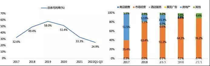 小商品城的营收及营收构成,资料来源:wind、36氪从毛利率来看,2021年,小商品城实现毛利率33.3%,趋势上,自2019年起,公司的毛利率持续下滑,一方面,毛利率较高的房地产业务被逐步剥离,另一方面,毛利率极低的商品销售业务规模急速扩大,业务结构的改变拉低了公司的毛利率水平。从毛利构成来看,市场经营业务仅作为公司第二大业务,却贡献了超75%的毛利,商品销售业务虽是营收的主要来源,但对总体利润的贡献微乎其微。< style="text-align: left; margin-bottom: 10px;">