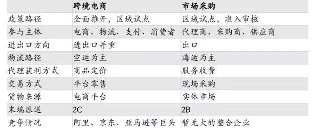 >市场采购贸易模式,资料来源:东吴证券与此同时,跨境电商与1039模式虽同为外贸新业态,但由于政策路径和行业性质的不同,两者在发展格局上存在显著的不同。跨境电商的份额早已被阿里、京东、亚马逊、eBay、速卖通等巨头抢占,竞争异常激烈,在市场采购贸易这一赛道仍是一片蓝海。< style="text-align: left; margin-bottom: 10px;">
