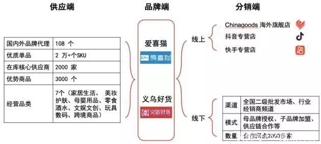 >市场经营业务的营收及毛利率资料来源:wind、36氪尽管经营面积庞大,但公司商位的出租率常年维持在较高水平,公司数据显示,2015年起,公司的商位出租率基本稳定在95%以上,2021年的商位出租率达98%。在供不应求的现状下,市场扩建带来的租赁面积的增加,以及商位的市场化定价带来的单位租金面积的提升成为了市场经营业务未来的主要看点。从经营面积来看,义乌国际商贸城二区东市场已于11月24日完成1-2层 478间的招商,总建面积达13.1万平米;义乌全球数贸中心项目也在11月25日动工,总建筑面积约130万平米。从对租金的影响来看,一方面,新市场将使用更为市场化的租金,并在租赁条款中设置相应的租金上浮条款;另一方面,公司最近数年将会收回约5%的铺位,并将这部分商铺进行公开拍卖,拍卖获得的市场化定价将高于过往。总体来看,作为业绩基本盘,商品销售业务仍十分稳固,公司在面积与单位租金的提升空间也足够支撑其在中长期内的增长。近年来,商品销售业务的规模开始显著扩大,在2021年超越了市场经营业务,成为了小商品城营收体量最大的业务。商品销售业务也叫自营贸易,主要包括跨境进口电商“爱喜猫”和小商品内贸电商“义乌好货”两大平台。从产业链来看,公司在上游拥有国内外品牌代理108个、在库核心供应商2000家;在下游拥有线上线下两大渠道,线上包括Chinagoods海外旗舰店、抖音专营店、快手专营店等,线下包括全国二级批发市场、行业经销商。< style="text-align: left; margin-bottom: 10px;">